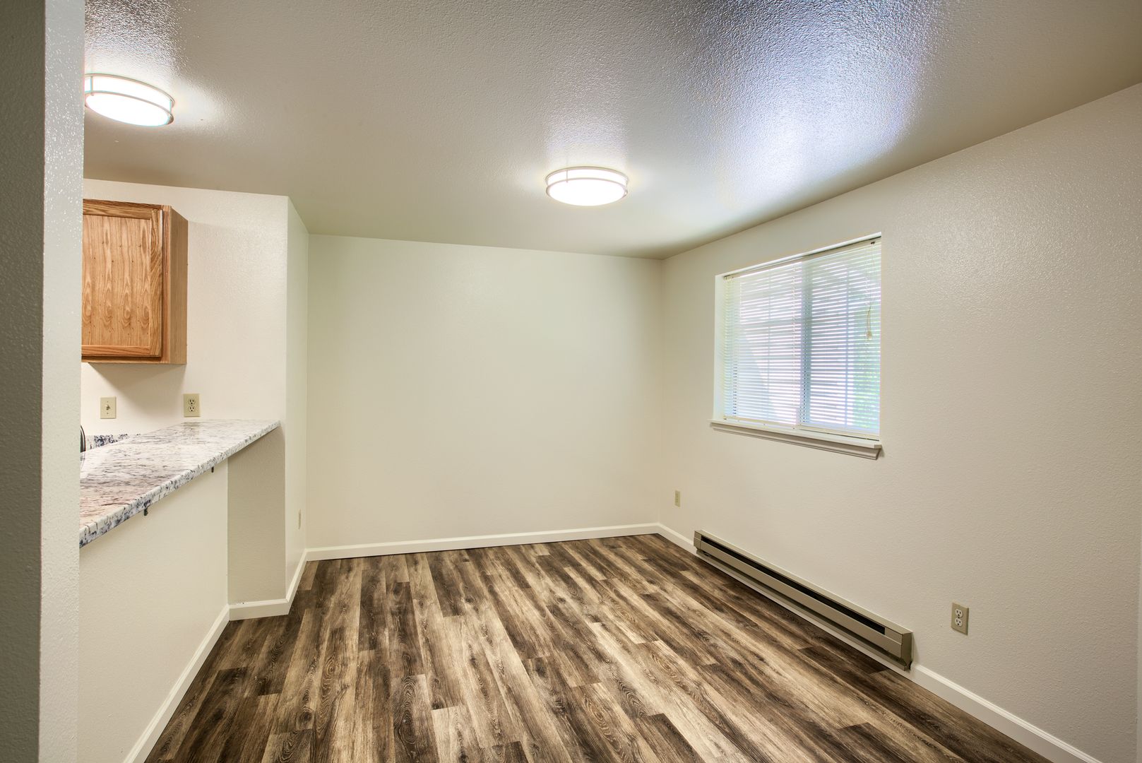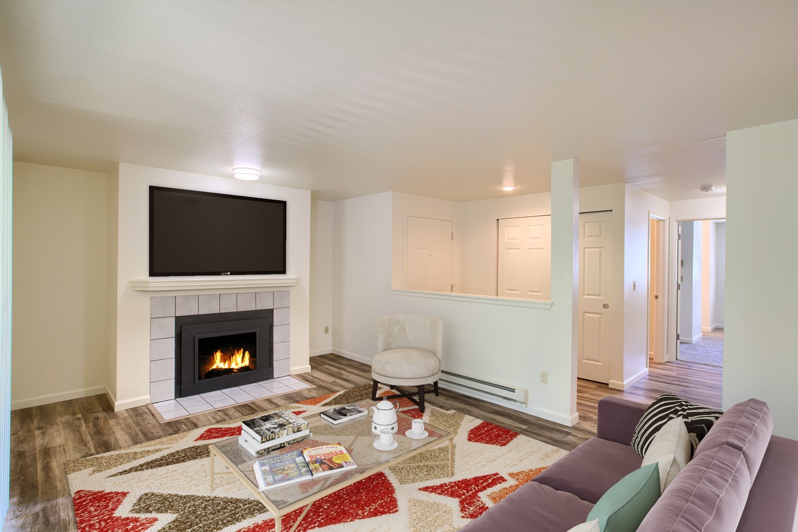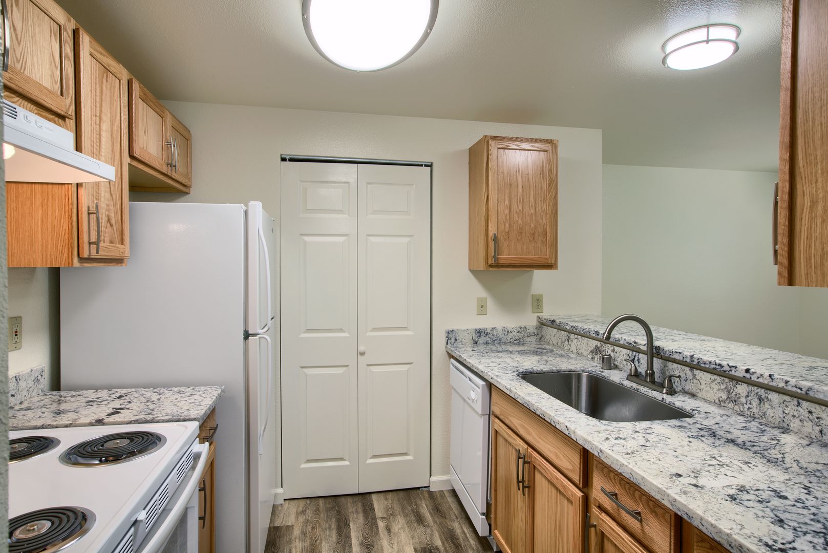 Water, sewer and garbage for this apartment is charged at a flat rate of ONLY $61! And NO ADMIN FEES. Your 2 bedroom/1 bath apartment home is fully equipped with a stove, refrigerator, dishwasher PLUS a large washer and dryer. Delight in wonderful upgrades to your kitchen and bathroom like soft-close cabinetry and granite countertops. Step comfortably into your home and over to your open living space that features luxury vinyl plank flooring, a fireplace and dining room with breakfast bar. Get some fresh air on your private patio or deck. Pass through double entry doors into your spacious main bedroom with private vanity and sink. At the end of your long day pull into your assigned, covered parking space available to you FREE of charge.
