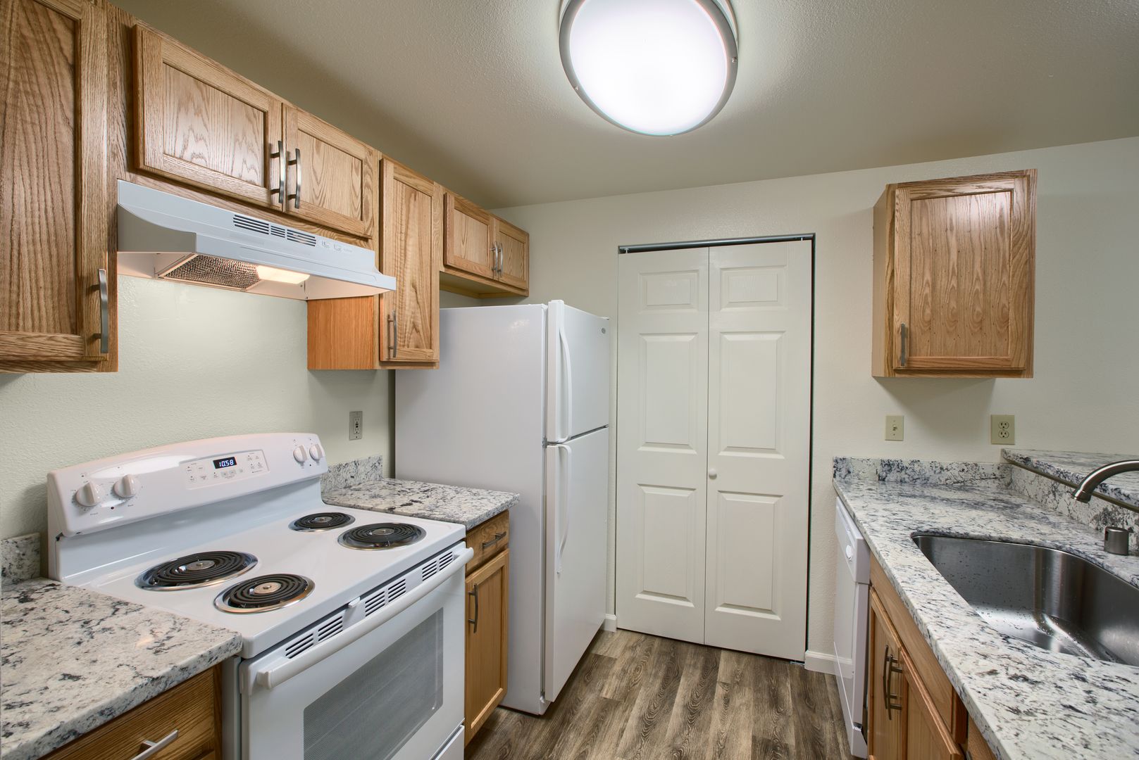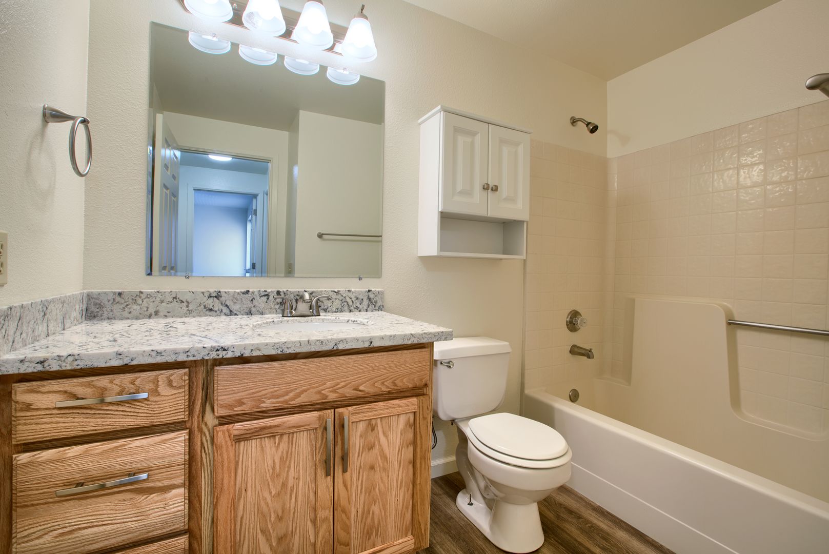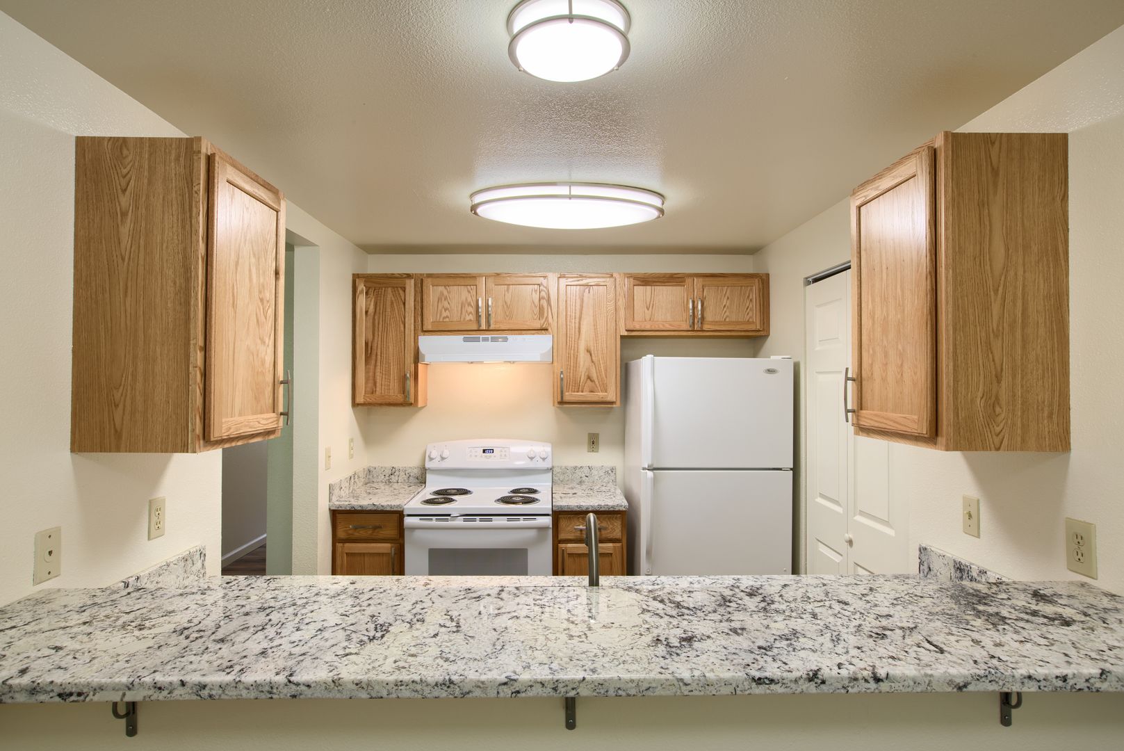 Water, sewer and garbage for this apartment is charged at a flat rate of ONLY $61! And NO ADMIN FEES. Your 2 bedroom/1 bath apartment home is fully equipped with a stove, refrigerator, dishwasher PLUS a large washer and dryer. Delight in wonderful upgrades to your kitchen and bathroom like soft-close cabinetry and granite countertops. Step comfortably into your home and over to your open living space that features luxury vinyl plank flooring, a fireplace and dining room with breakfast bar. Get some fresh air on your private patio or deck. Pass through double entry doors into your spacious main bedroom with private vanity and sink. At the end of your long day pull into your assigned, covered parking space available to you FREE of charge.